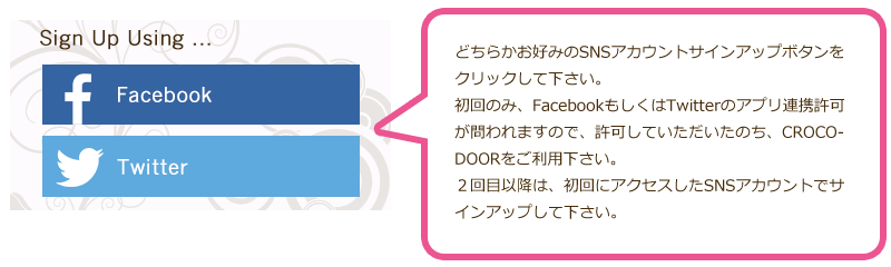 COROCODOORでは面倒な会員登録手続は不要です。SNSアカウントがあれば誰でも簡単にご利用いただけます。